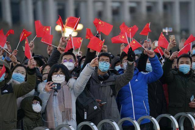 1月1日晨,北京天安门广场举行隆重的升国旗仪式。这是观众在升旗仪式结束后挥舞国旗。